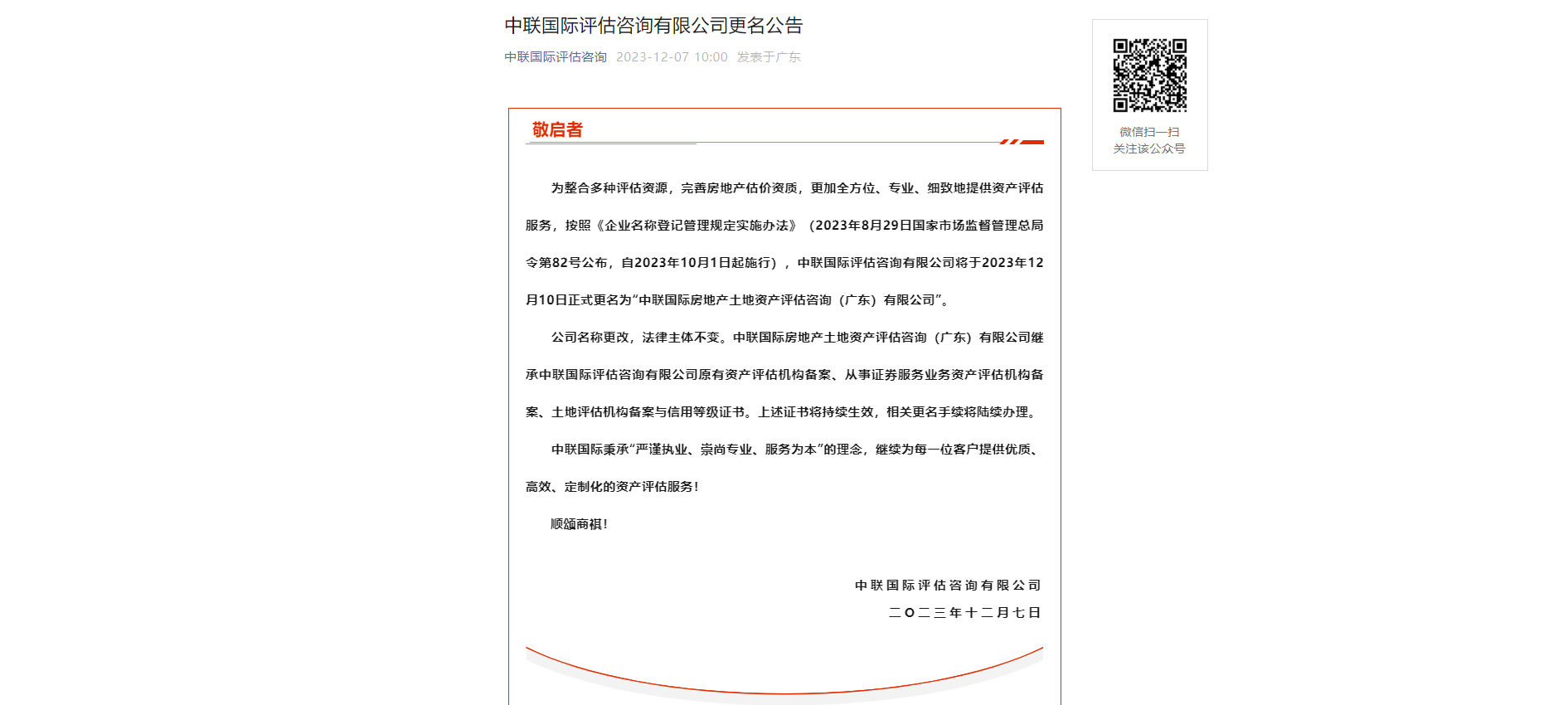 中聯國際評估咨詢有限公司于2023年12月10日正式更名為“中聯國際房地產土地資產評估咨詢(廣東)有限公司”...